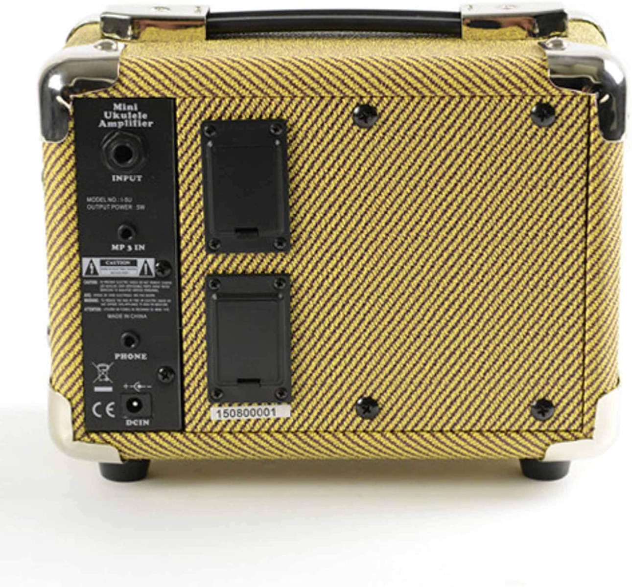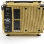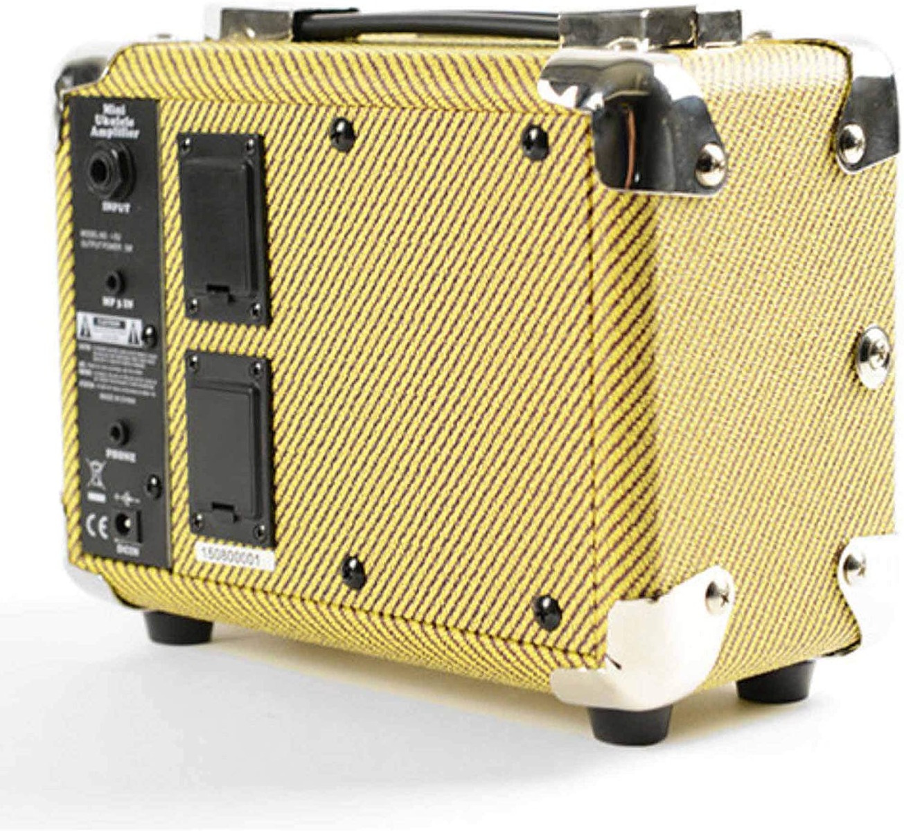 AMPTWD5U MINI AMPLIFICADOR DE UKELELE PORTATIL Potencia: 5W. Altavoz: 5” Controles: Volumen agúdos y graves. Salida para auriculares. Entrada auxiliar. 9 V polaridad inversa (interior negativo). Funciona con 2 pilas de 9Voltios (portatil) o enchufado a la red mediante adaptador de 9 voltios incluido. Acabado: Tweed (Tejido de lana). Medidas: 17.8 x 20.3 x 11.4 cm. Peso: 2 kg. No compatible con U•BASS®.